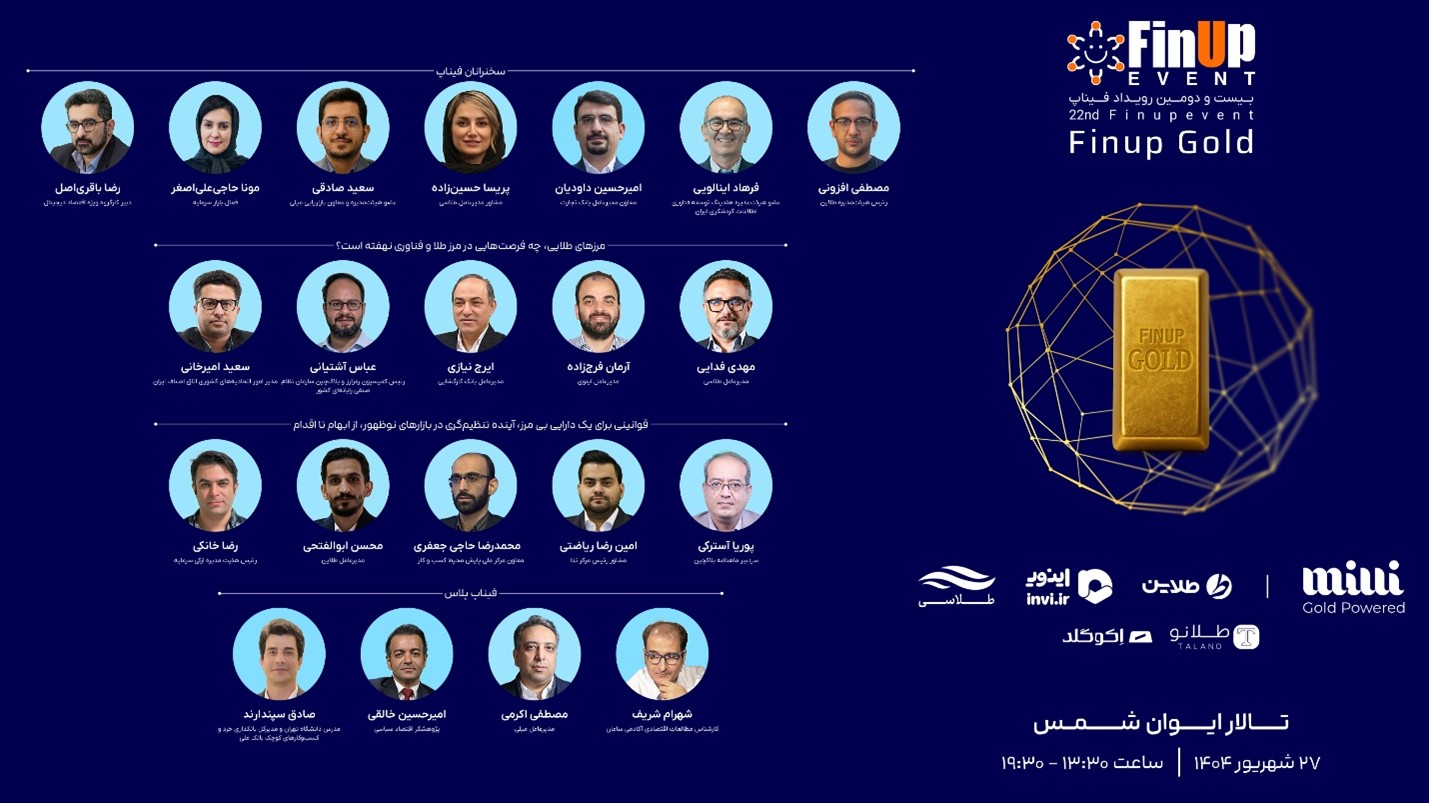 بیستودومین رویداد فیناپ با عنوان Finup Gold روز پنجشنبه، ۲۷ شهریور ۱۴۰۴، از ساعت ۱۳ تا ۲۰ در تالار ایوان…